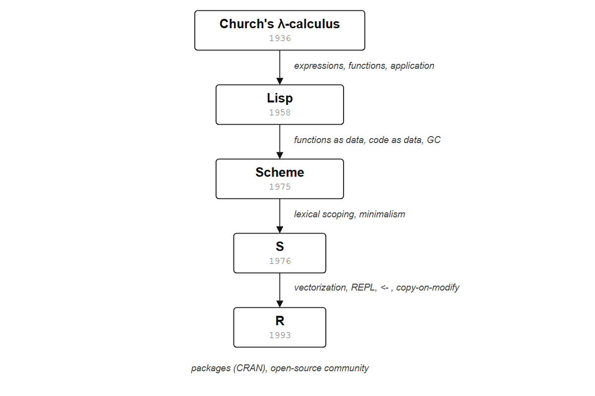 That code used four ideas R did not invent: first-class functions, vectorized operations, higher-order functions, and lexical scope. They arrived from different languages and different decades.
