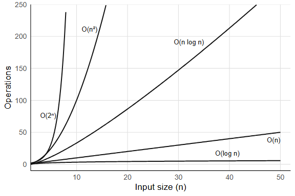 The simplest test: double n and see what happens to the time. If the time roughly doubles, you have O(n); if it roughly quadruples, O(n²). Try this with sum(rnorm(n)) (linear) versus the c() growth loop (quadratic) for n = 1000, 2000, 5000, 10000. The ratio test works because Big-O captures the exponent, and doubling the input raises a power-law relationship to the surface. What happens when the ratio is somewhere between 2 and 4? A ratio near 2.8 when you double n suggests O(n^1.5), and in general a ratio of r implies a growth exponent of log2(r). You can also fit a log-log regression: plot log(time) against log(n), and the slope estimates the exponent directly.