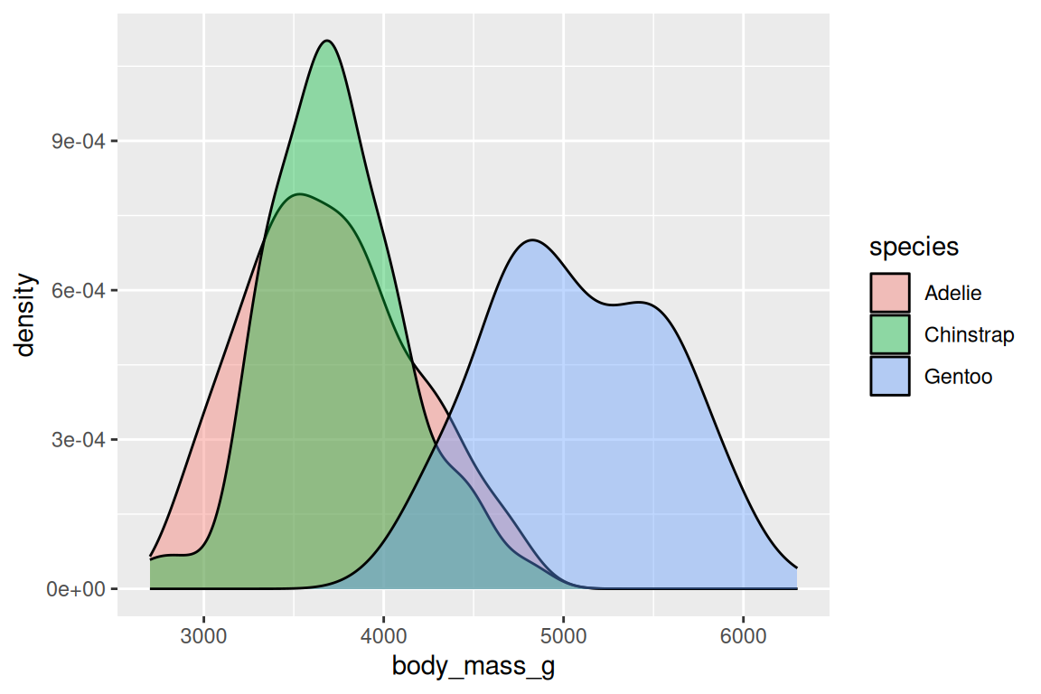body_mass_gbyspecies, withbinwidth = 100. Usefill = speciesand setalpha = 0.7. - Start from the full example above and modify it: change the geom to