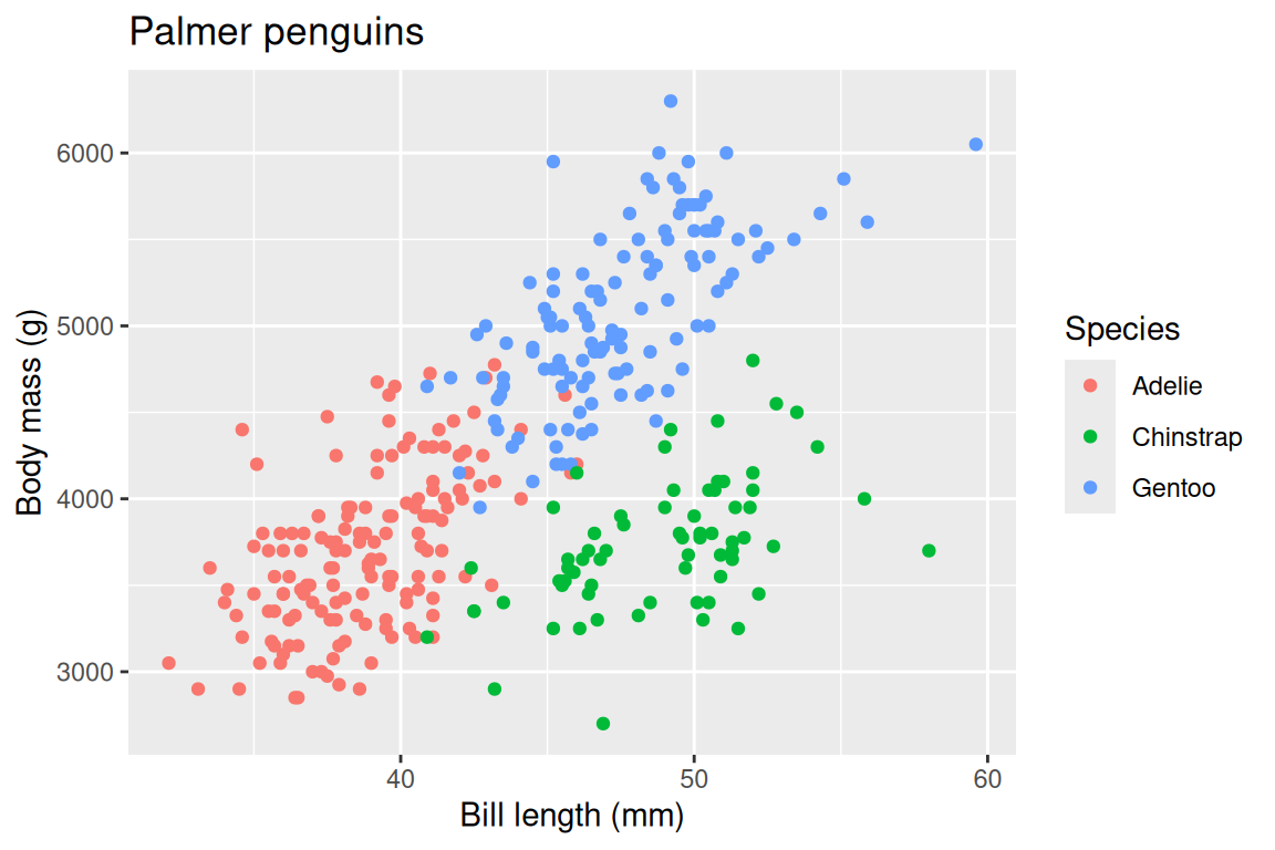 p <- ggplot(penguins, aes(x = bill_length_mm, y = body_mass_g, color = species)) +