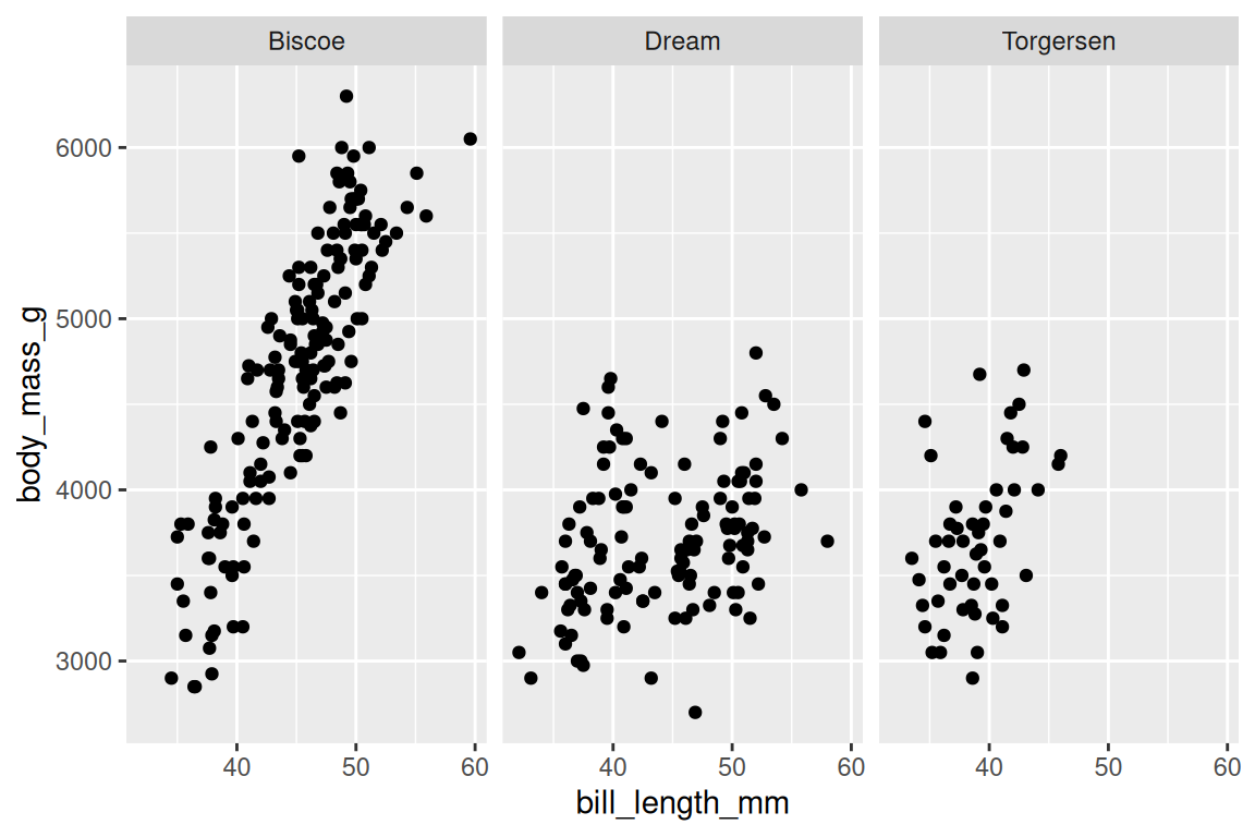 - Facet the penguins scatterplot (bill length vs body mass) by