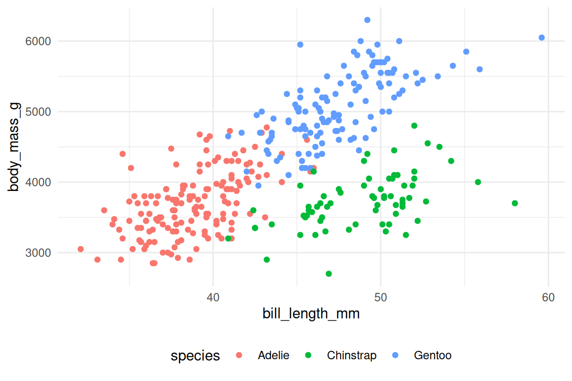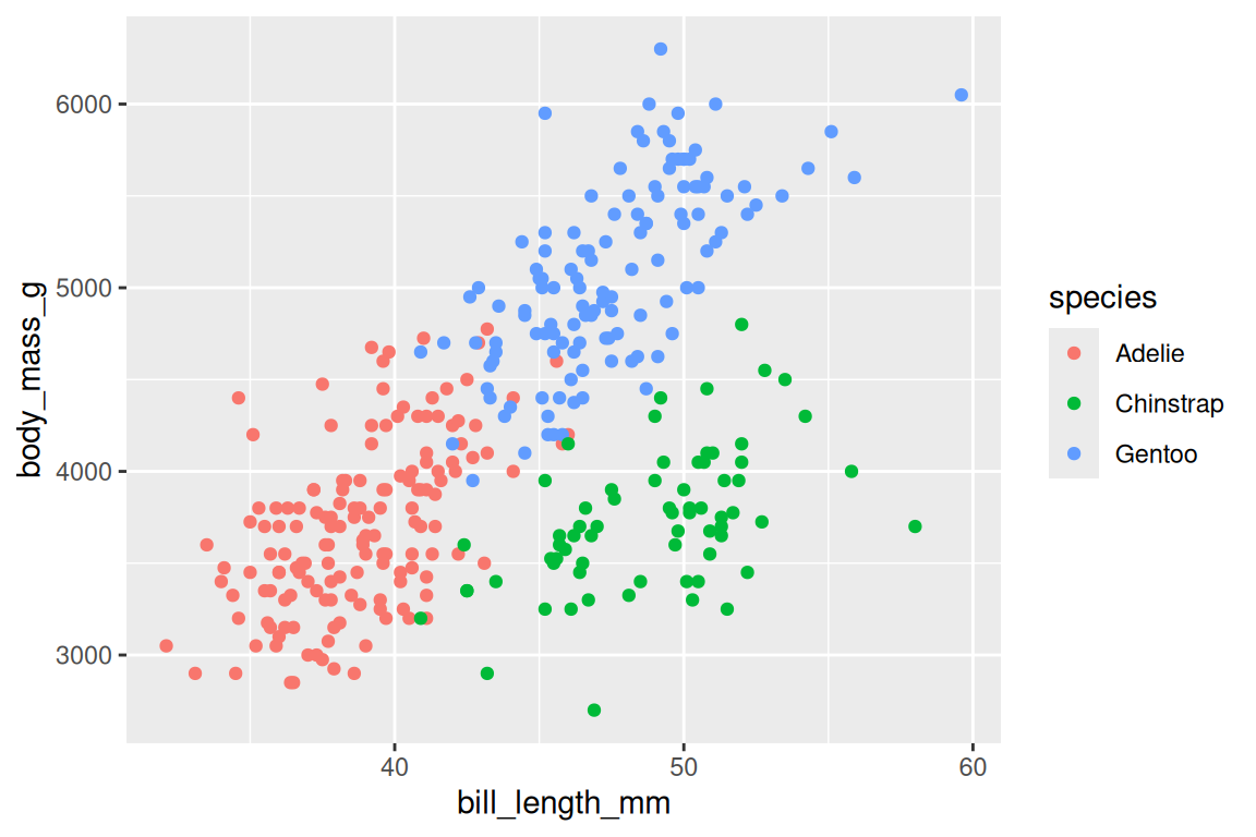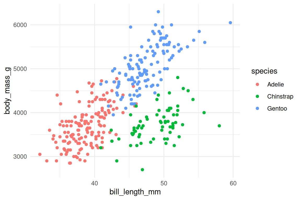 ggplot(penguins, aes(x = bill_length_mm, y = body_mass_g, color = species)) +