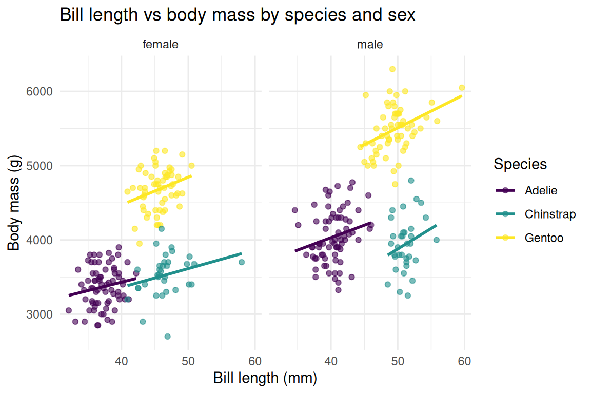 Here is a complete example, built step by step. Read it like a sentence: take penguins, remove missing sex, map bill length to x, mass to y, species to color, draw points, add linear fits, split by sex, use viridis colors, label everything, apply a minimal theme.