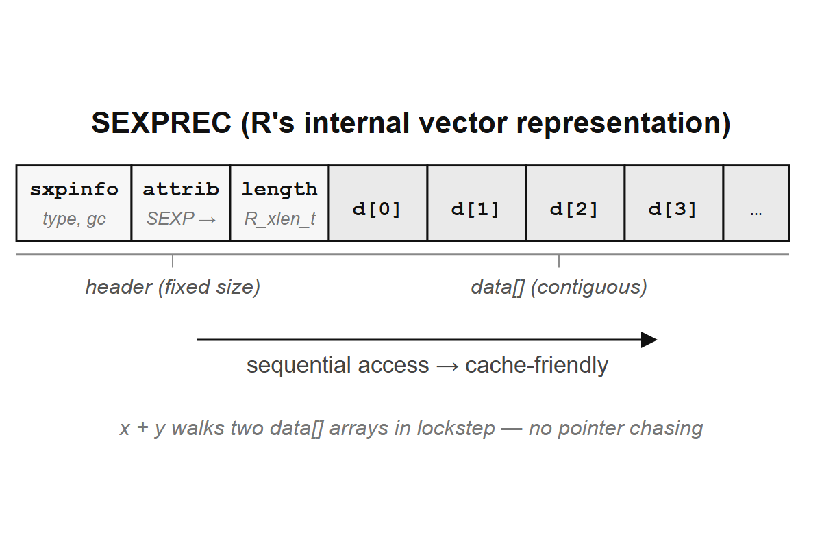 };The contiguous layout is why vectorized operations are fast. When R computes x + y, the C code walks two arrays of doubles in lockstep, reading from sequential memory addresses; modern CPUs are optimized for exactly this access pattern, with hardware prefetchers loading the next cache line before you need it and SIMD instructions adding multiple doubles in a single clock cycle.
